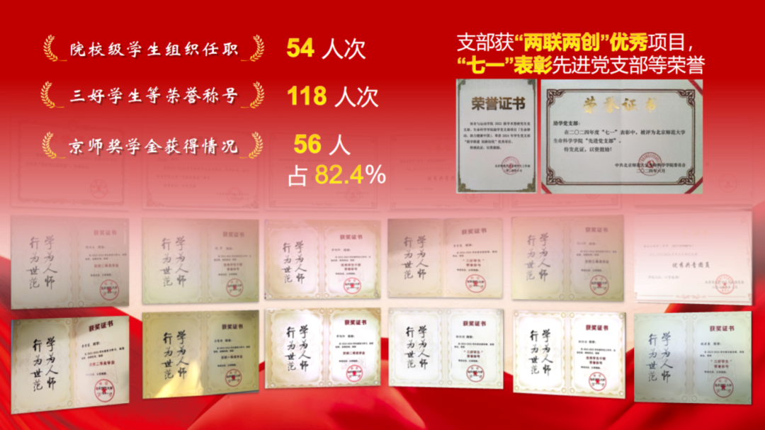 近年来,支部中涌现出 iGEM 国际竞赛金奖获得者、北京市三好学生、bat365官网登录入口体育“十佳大学生”、bat365官网登录入口体育“十佳志愿者”、bat365官网登录入口体育“自强之星”、bat365官网登录入口体育“阳光体育之星”等优秀个人。支部自身也屡获殊荣,连续两年参与“两联两创”项目,连续三年获bat365在线唯一官网登录官网“先进党支部”,2023 年获bat365官网登录入口体育“先进党支部”,2024 年获“两联两创”优秀项目。