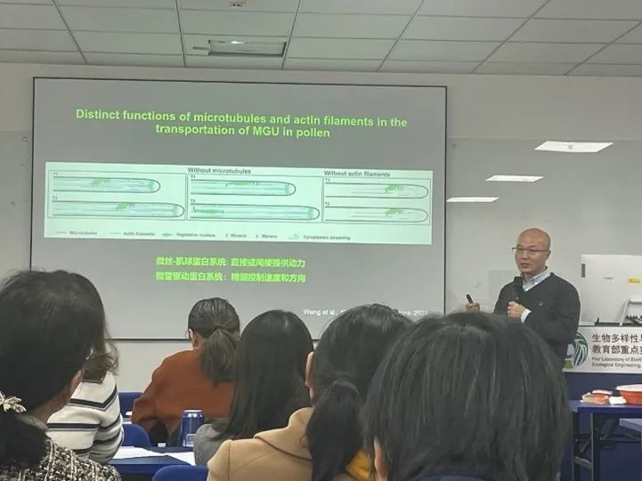 张毅老师的报告题目为“植物精细胞运输研究进展”,主要介绍植物细胞骨架调控精细胞运输的研究进展和遇到的问题,包括利用荧光标记探究雄性生殖单位维持与运输中微管的具体作用,识别关键驱动蛋白QQ1、QQ2及其的定位点、定位方式、突变体影响等内容。最后张毅老师讲解了现阶段研究遇到的困难,并就此与参会老师进行深入交流并讨论。