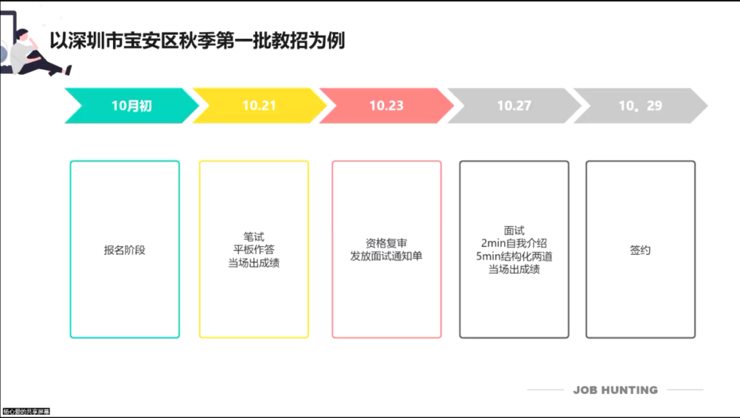 之后,结合自身成功签约深圳市宝安区的经历,杨心爱同志分享了地方校招的时间线与流程:从10月初报名、资格审核,到笔试(60道客观题,含行测、教育知识、学科专业题)、面试(2分钟自我介绍+5分钟结构化问答),全程节奏紧凑,需提前熟悉流程并预留时间弹性。针对本科生比较关注的“考研 VS 就业”抉择,她建议以国庆为节点:若前期复习状态稳定、抗压能力强,可坚持备考;若感到压力较大,可将求职作为调节,同步关注招聘信息。签约前需仔细阅读违约条款,尤其注意违约金金额(如深圳部分岗位违约金高达5万元),并明确升学、考公等特殊情况的免责条款。
