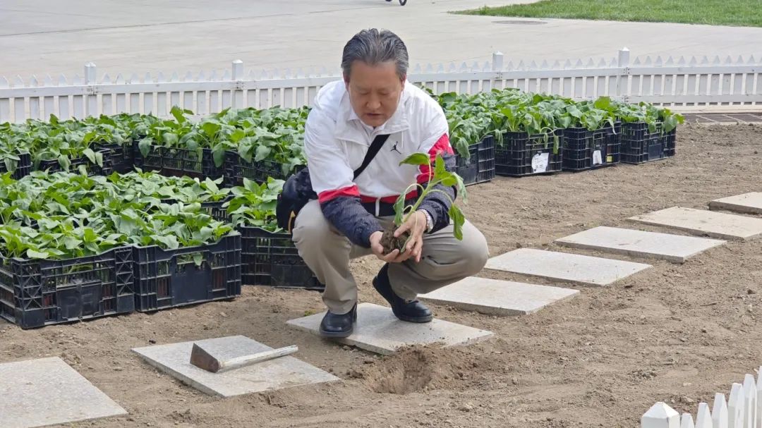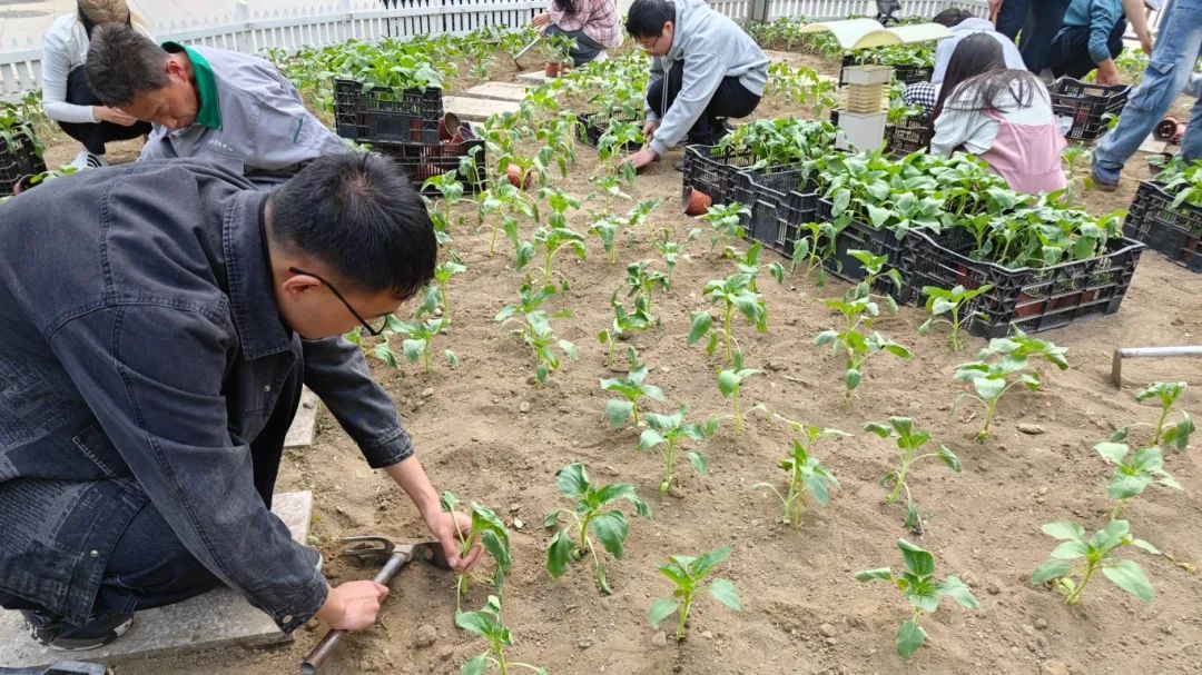 在理论知识讲解完毕后,后勤处的师傅们现场演示了规范的种植流程。从松土深度到幼苗移栽,从覆土技巧到种植规范,每一个步骤都细致入微。师傅们手把手教学,志愿者们领取到工具之后纷纷投入种植活动当中,现场劳动氛围浓厚。