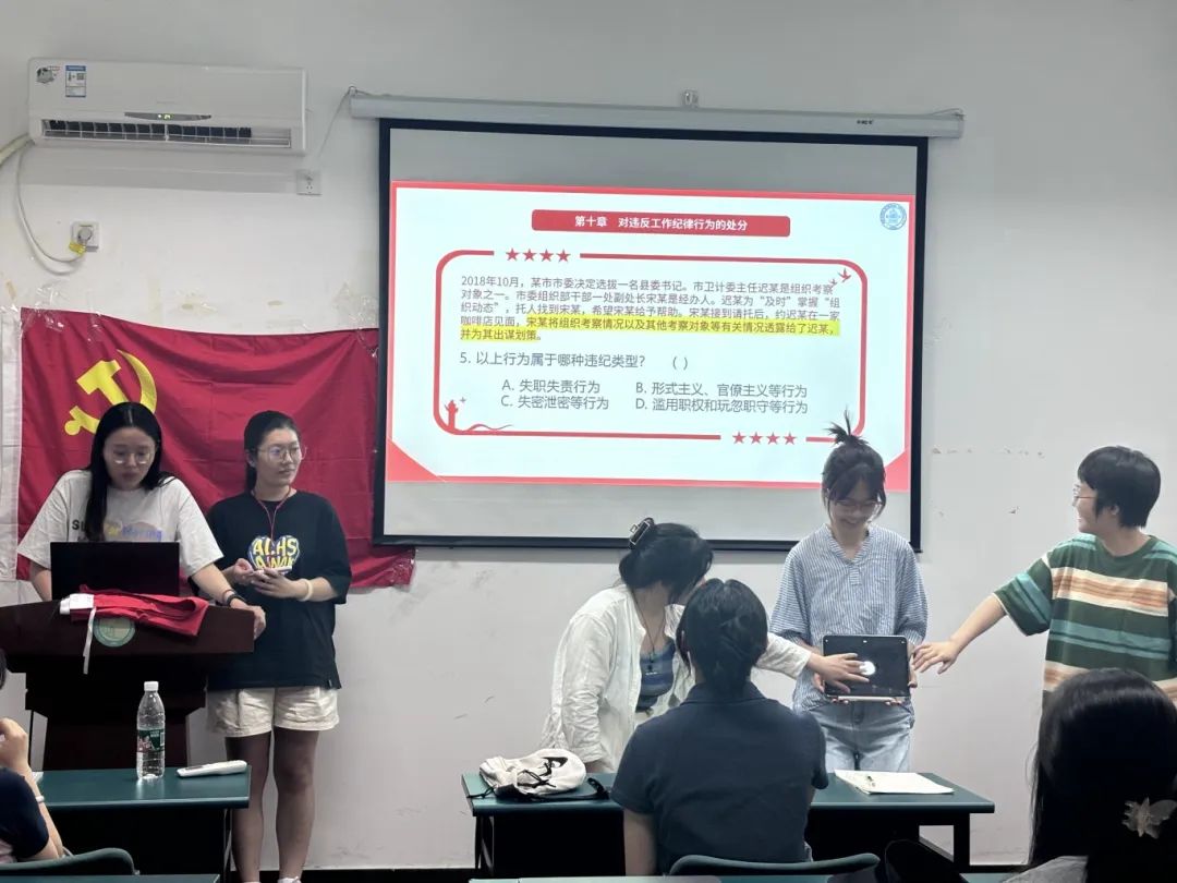 为贯彻落实党中央关于开展党纪学习教育的部署,深入学习领会《中国共产党纪律处分条例》,引导广大党员牢固树立党规党纪意识,坚守纪律底线,2024年6月20日晚20:00,致知党支部于bat365在线唯一官网登录官网129会议室组织全体成员开展“学条例,明纪律,守规矩”党纪学习教育主题知识竞赛,党支书罗兴宇同志主持竞赛。
