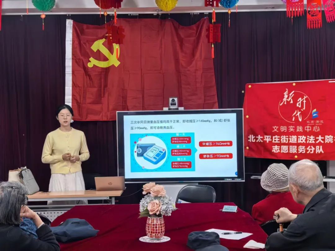 围绕高血压的课题,宣讲团来到学院南路32号社区、冶建院社区等8个社区,杨子怡、钏仕琼等同志针对中老年群体,深入讲解高血压的成因、症状及防治策略。课程结合生活实例,强调早期干预的重要性,为社区居民带来不一样的课堂。在政法大院社区,杨子怡同志于4月22日通过案例解析开展授课,通过互动问答帮助居民更好地掌握知识。本次课堂让居民注意日常造成风险的相关因素,同时生动演示了健康管理方法。课堂反响热烈。