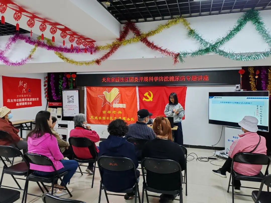 宣讲团在师大北路社区、天兆家园社区等9个站点开展糖尿病相关课程。团队成员普及糖尿病知识,涵盖饮食控制、运动疗法及并发症预防等内容。蔡琳璨同志和王若溪同志用图文并茂的PPT展示血糖监测技巧,认真讲解,耐心教授,从而让青少年和中老年人理解生活方式对疾病的影响。