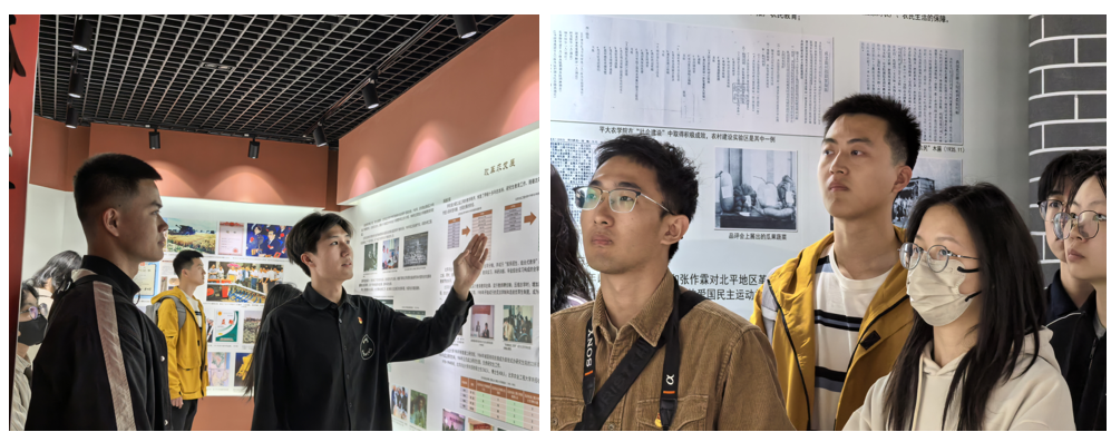 活动伊始,两支部党员代表齐聚中国农业大学校史馆。校史馆讲解员刘芳妮与中国农大硕士2024级生态学党支部(以下简称“农大生态学党支部”)书记马涛同志的联合讲解,通过珍贵的史料与实物展示,回溯农大百余年办学历史,感悟“解民生之多艰,育天下之英才”的校训精神,两党支部的同志收获颇丰。