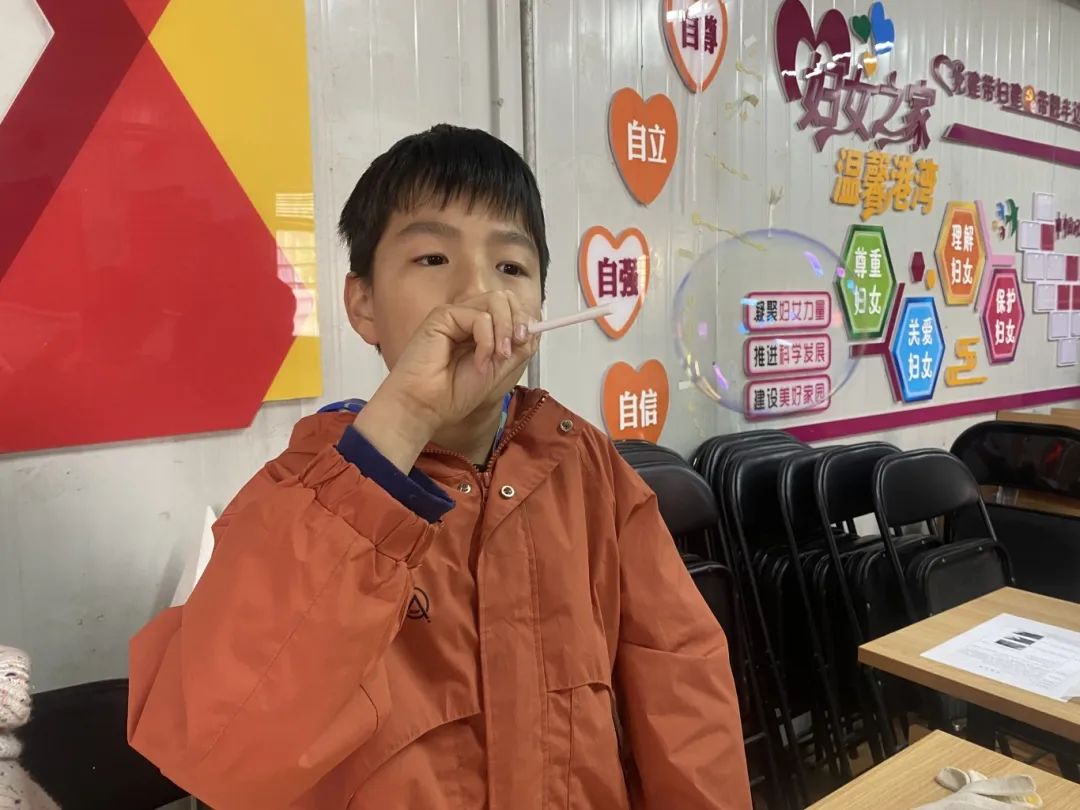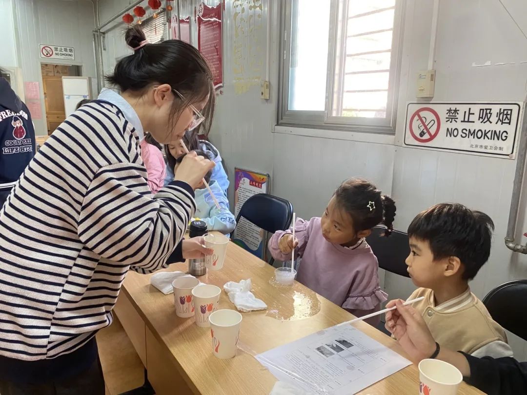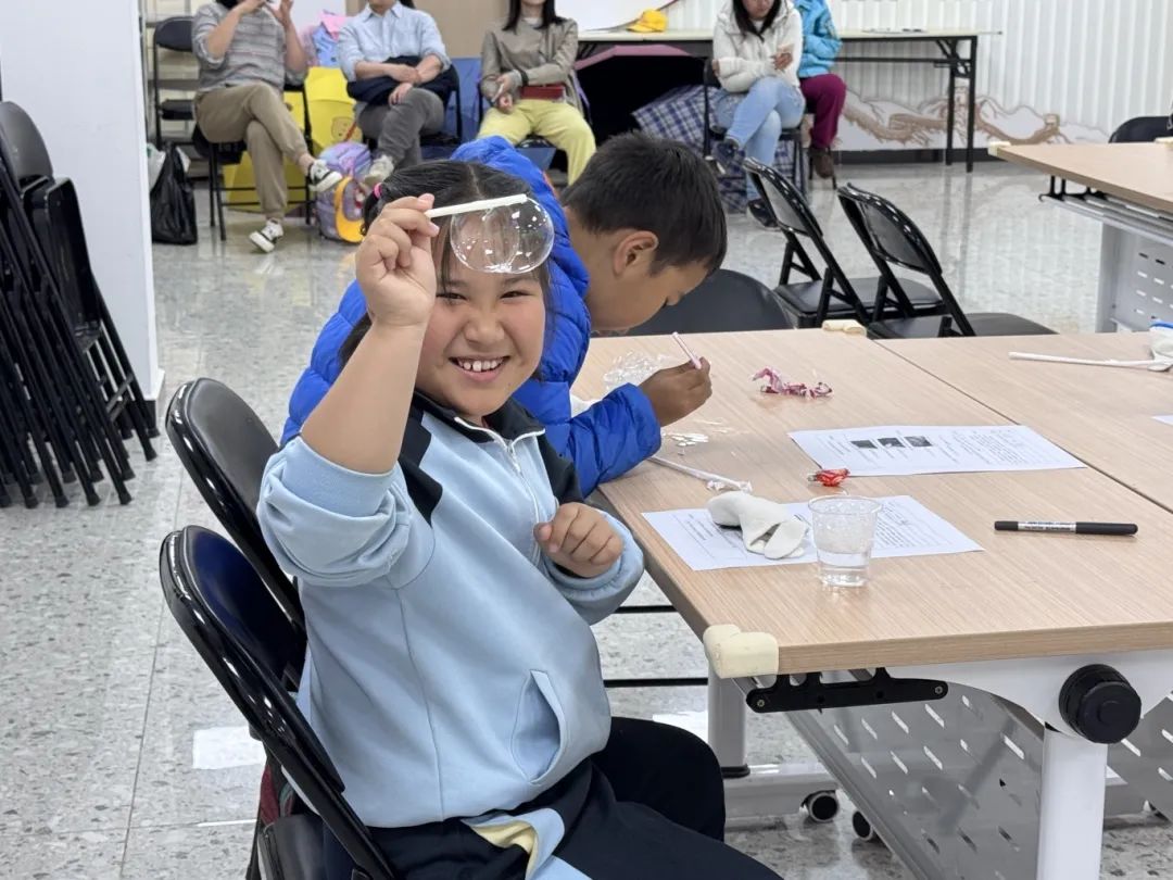 如同在蓟门里社区一样,苏慧岚老师为小朋友们细致生动地讲解了泡泡表面张力的知识,随后带领大家一起动手完成了 实验。在实验过程中,主讲和助教老师耐心指导小朋友们调配泡泡水,对比加盐和加糖后泡泡的变化,最后,大家戴上手套,成功实现了“弹跳的泡泡”。在欢声笑语中,科普课来到了尾声,小朋友们意犹未尽,苏慧岚老师鼓励大家在课后用不同的材料尝试,吹出更坚固的泡泡。