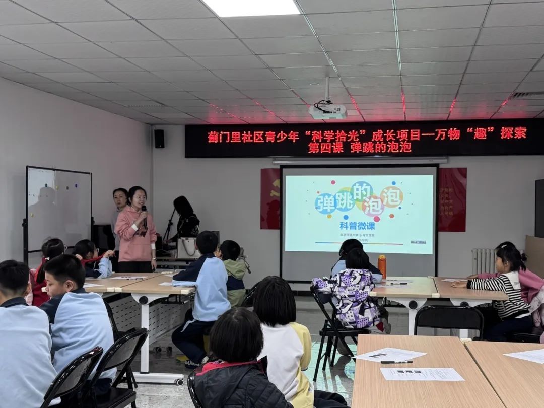 2025年4月18日16:30,北太平庄街道蓟门里社区迎来了一场趣味盎然的科普课《弹跳的泡泡》。本次课程面向蓟门里社区青少年开展“科学拾光”成长项目——万物“趣”探索系列课程,旨在让同学们在实践中感悟自然现象的奥秘,在动手过程中培养对生命科学的兴趣。