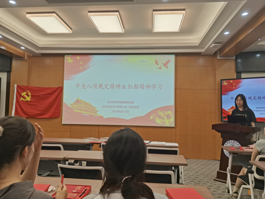 2025年6月23日19:00,bat365在线唯一官网登录官网崇德党支部联合化学学院24级硕士生一班党支部在化学楼二楼学术报告厅开展支部书记讲党课活动,会议由崇德党支部书记陈昱臻同志和化学学院24级硕士生一班党支部书记武文琦同志主持。本次党课的主题是:中央八项规定精神和红船精神。