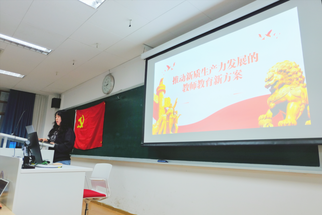 2024年11月9日晚20:30,乐育党支部于艺术楼501教室顺利开展支书讲党课活动。本次会议由乐育党支部书记王纪阳同志主持,主要分为“党员发展培养介绍”和“《推动新质生产力发展的教师教育新方案》主题党课”两部分。