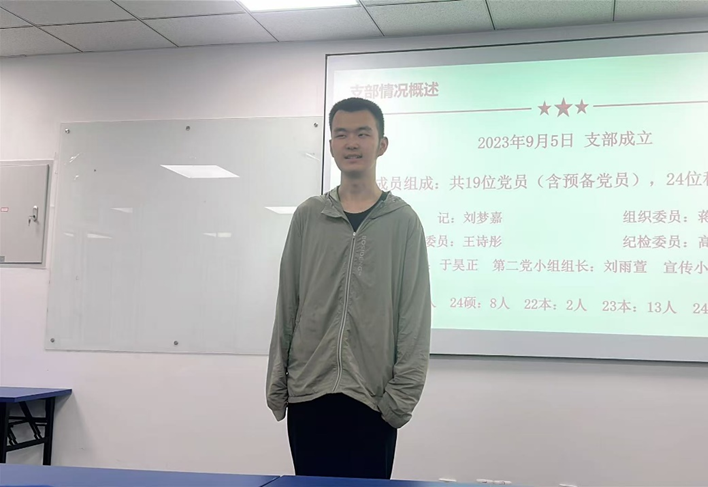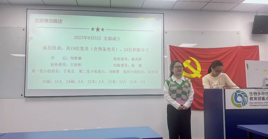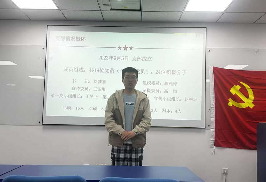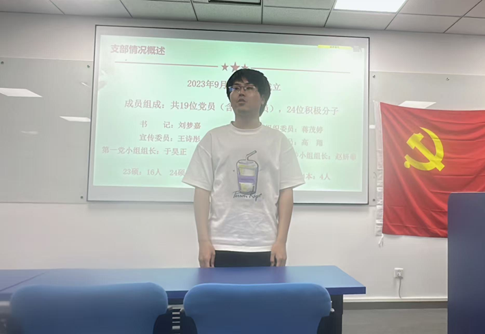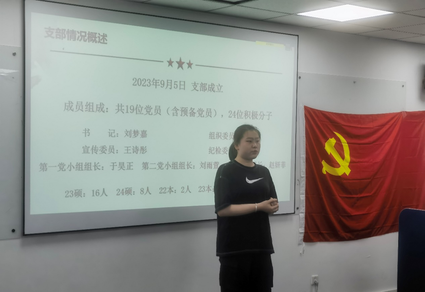 党支部书记刘梦嘉同志对支部情况进行介绍。首先刘梦嘉同志对支部组成进行了介绍,各党支委及党小组组长分别介绍了自己的工作内容;随后,刘梦嘉同志进一步介绍了支部所开展的特色活动及支部的工作方法。