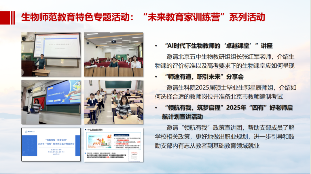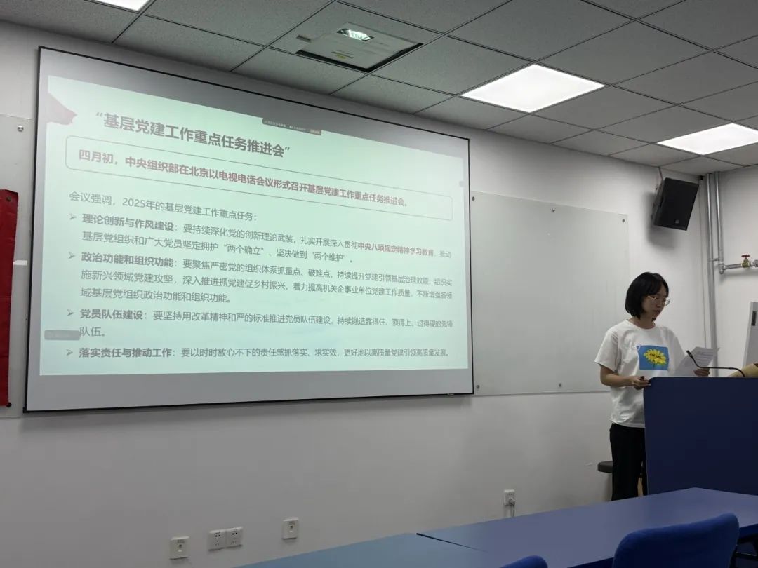 支部书记周雯睿同志就支部过去一学年的工作和活动开展进行总结,其中包括三会一课、党员发展与培养情况、理论学习脉络、生物师范教育特色专题活动等方面,回顾了一年以来的支部建设成果,肯定了上一届支委和党小组长们的辛勤付出,也对未来支部发展进行展望。