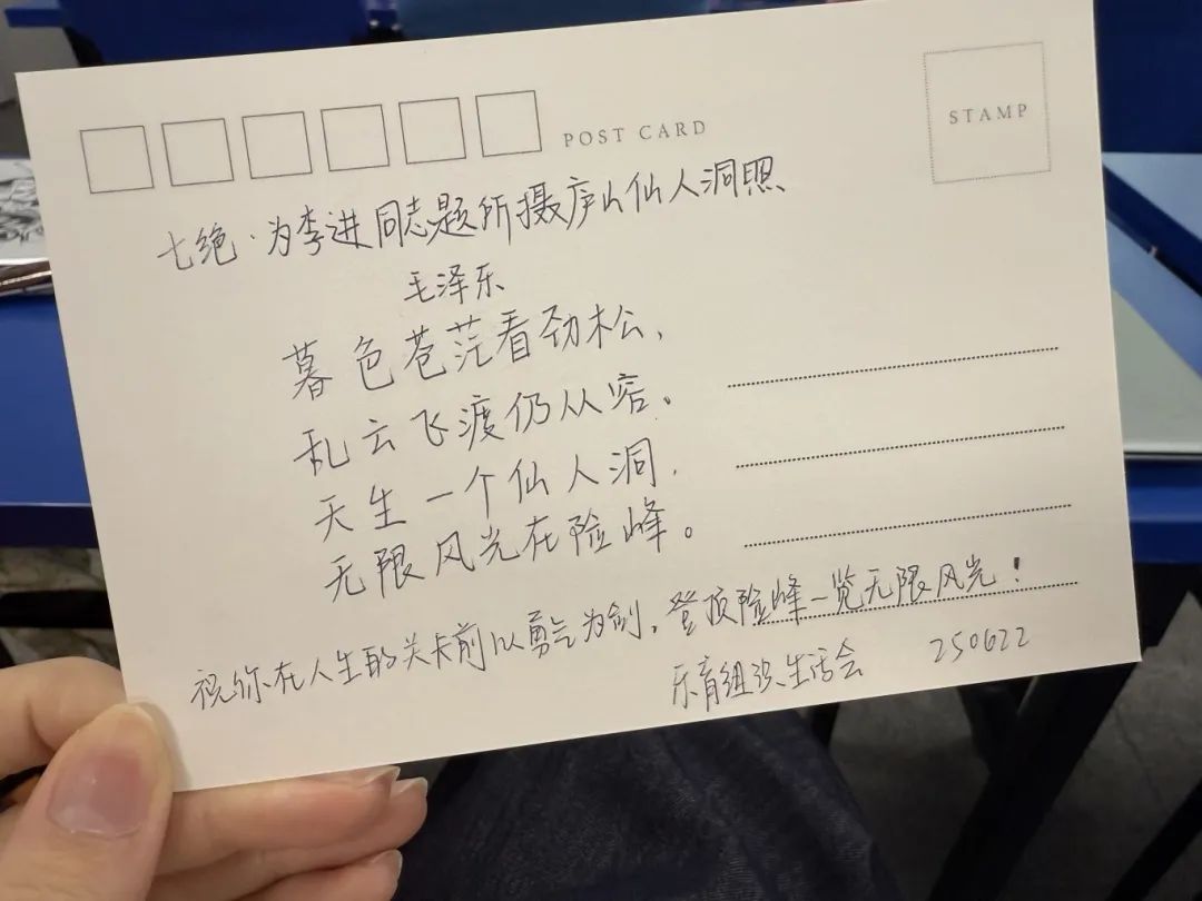 全体支部同志们在定制的贺卡背面书写祝福明信片,字里行间传递着对毕业生同志们的感谢与对支部未来发展的美好祝愿,最后大家互赠寄语。