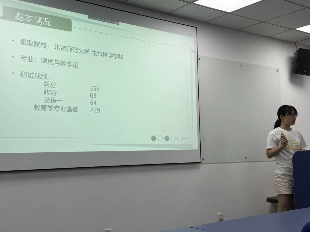彭可馨同志就课程与教学论的考研经历进行了分享。对于需要准备复习的科目,目标专业录取的名额限制等情况,彭可馨同志均毫无保留地向大家一一介绍。
