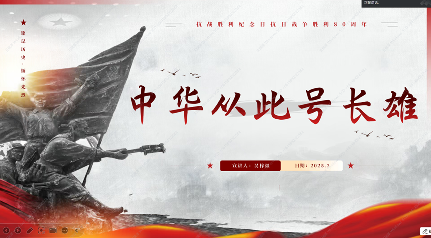 吴梓煜同学以“中华从此号长雄”为主题,从民族复兴的宏观视角切入,深情回顾了中国人民抗日战争的伟大历程。他通过丰富的历史资料和生动的讲述,带领在场党员重温了全民族抗战的壮丽史诗,阐述了中国共产党在抗战中发挥的中流砥柱作用。
