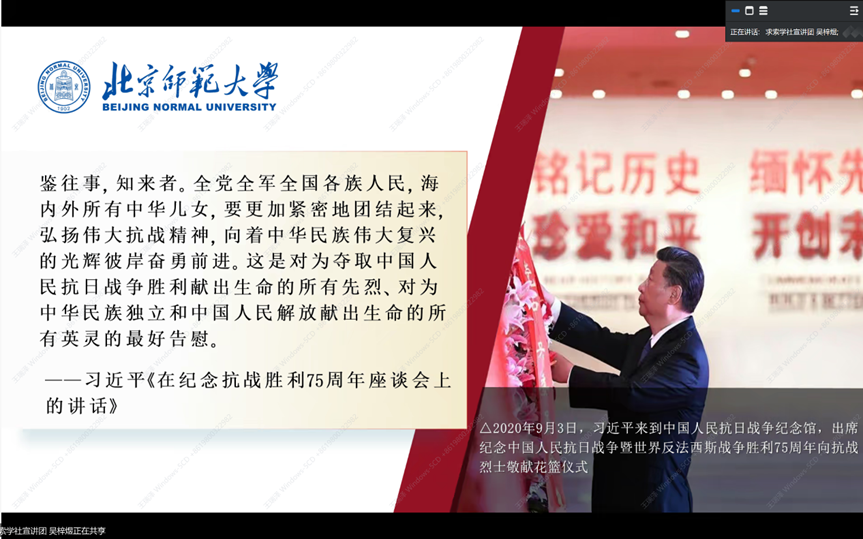 结合习近平总书记在纪念中国人民抗日战争暨世界反法西斯战争胜利75周年座谈会上的重要讲话,吴梓煜同学系统讲述了伟大抗战精神的丰富内涵和时代价值。他讲到抗战精神是中国人民弥足珍贵的精神财富,是激励中国人民克服一切艰难险阻、为实现中华民族伟大复兴而奋斗的强大精神动力。