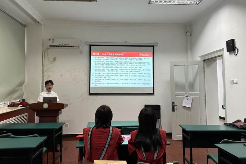 中央八项规定精神学习。中央八项规定自2012年出台以来,历经十余年淬炼,已成为新时代党的建设的标志性成果。它不仅是改进作风的“先手棋”,更是关乎党和国家事业兴衰的“关键招”。支部书记王士政领学中央八项规定主要内容,引导毕业生党员强化纪律意识、加强自我约束,要以“永远在路上”的清醒和坚定,把中央八项规定精神化作日常习惯和自觉遵循,要稳中求进、善作善成。