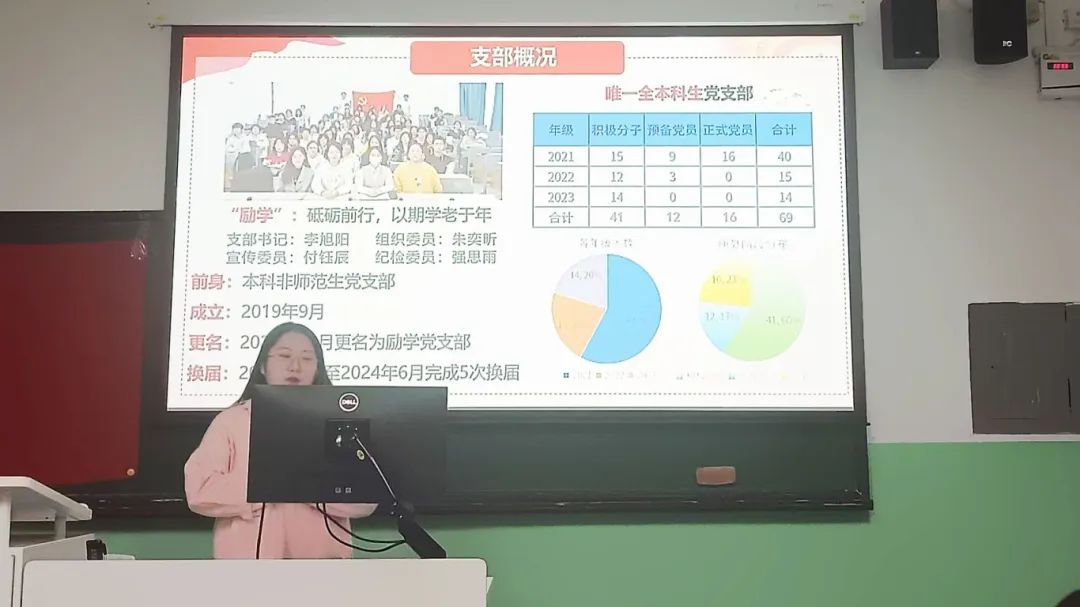 党支部书记李旭阳同志进行述职。李旭阳同志首先介绍了励学党支部概况,包括成员、前身、成立时间、更名情况、换届情况等,重申了“励学”的含义:“砥砺前行,以期学老于年”。随后,李旭阳同志列举了励学党支部规范党员发展的举措,回望了党支部开展的一系列志愿服务和科技创新等实践活动。最后,李旭阳同志展示了励学党支部的风采风貌,包括志愿服务成果和各项荣誉,并感谢了同志们的努力与付出。