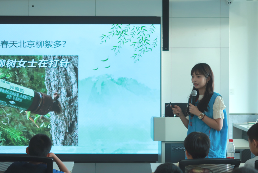 课堂以“柳絮治理小妙招”为切入点,通过如“给柳树‘打针’”的趣味比喻和互动问答,引导学生思考柳树的文化与生态价值。同学们从古诗中的“杨柳拂堤”到老舍笔下的北平夏景,感受柳树与北京的历史羁绊;通过对比柳树、杨树等树种的固碳释氧数据,深入理解了柳树作为“生态多面手”的重要意义。课程还结合碳中和目标,呼吁绿色出行,并揭秘了柳叶预报天气的趣味现象。