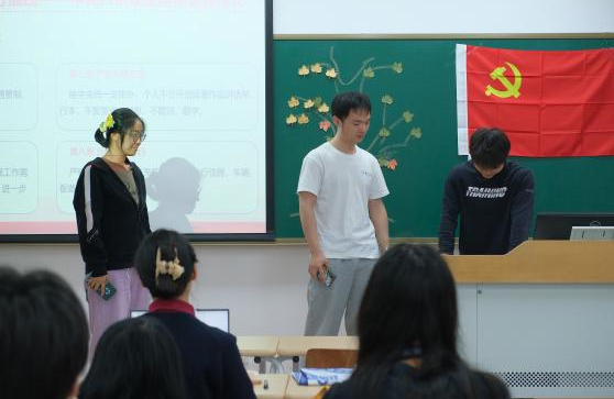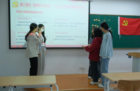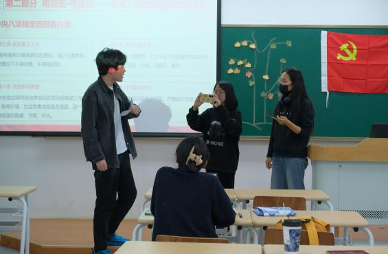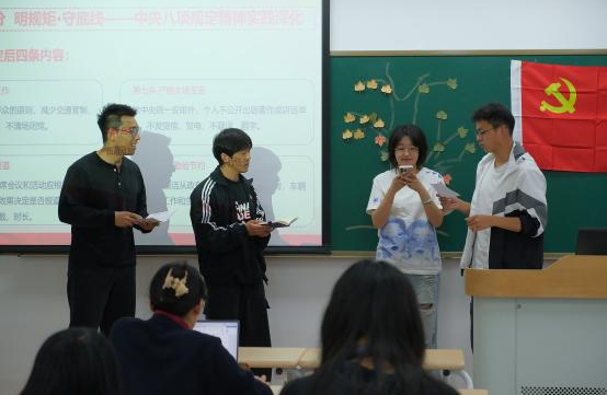 领学人率先带领全体党员认真朗读八项规定原文后四条,夯实理论基础。随后,各小组紧扣规定要求,围绕“未经批准出版著作”“过度报道领导讲话”等违规情景,以生动鲜活的演绎还原问题场景。同学们通过生动的表演,将违反八项规定行为的危害和后果展现得淋漓尽致,让抽象的纪律条文转化为直观的警示教材。