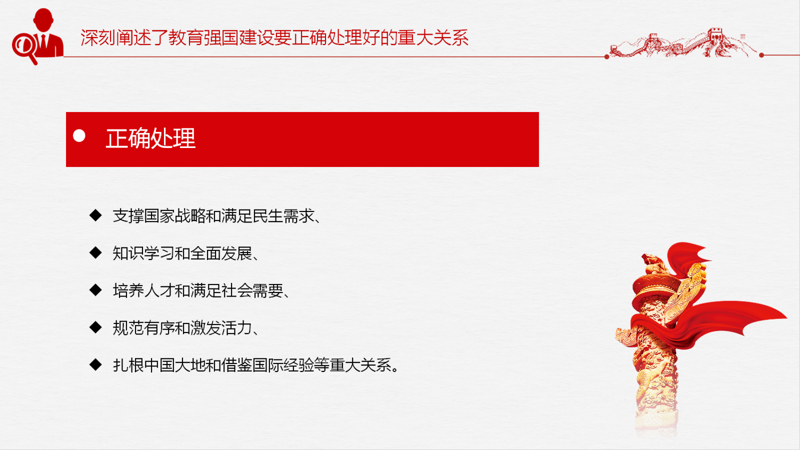 接着,张瑜同志深刻阐述了教育强国建设要正确处理好的重大关系。建设教育强国是一项复杂的系统工程,要正确处理支撑国家战略和满足民生需求、知识学习和全面发展、培养人才和满足社会需要、规范有序和激发活力、扎根中国大地和借鉴国际经验等重大关系,紧紧围绕立德树人根本任务,坚持社会主义办学方向,坚持和运用系统观念,培养德智体美劳全面发展的社会主义建设者和接班人。