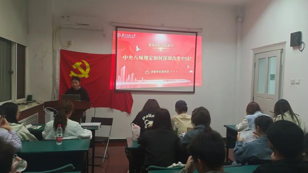 为深入学习贯彻中央八项规定精神,深刻感悟其对中国发展带来的深远影响,2025年4月22日,求实党支部联合求索学社宣讲团开展专题学习活动。全体党员与入党积极分子精神抖擞,以饱满的热情投入到这场意义非凡的学习交流中,共同探寻中央八项规定如何深刻改变中国的时代密码。