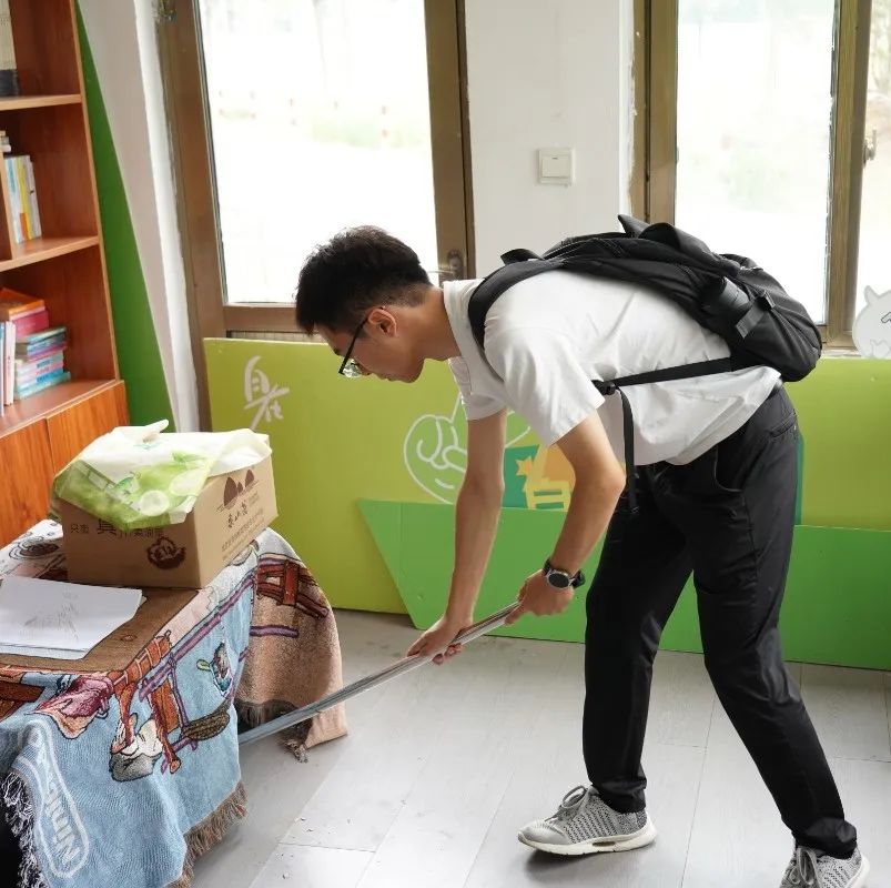 参观结束后,恰逢六一儿童节来临之际,为保障儿童节活动顺利开展,同学们迅速分组,与工作人员默契配合,投身到活动场地布置工作中。室内,大家分工明确,有人合力搬离闲置桌椅、有人细致清理地面窗台积尘、还有人专注地用充气筒打气球。在大家共同努力下,原本杂乱的室内焕然一新,洋溢着欢快的节日气息。