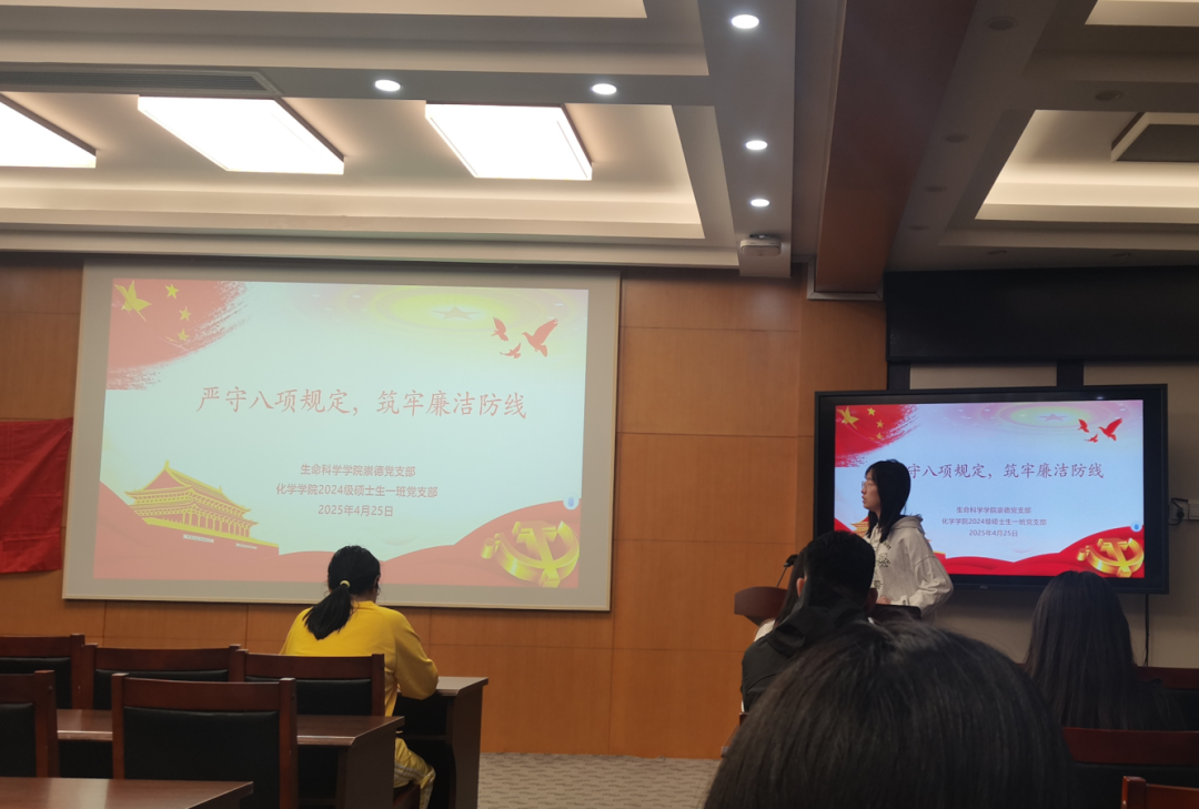 2025年4月26日19:00,崇德党支部联合化学学院24级硕士生一班党支部在化学楼二楼学术报告厅开展支书讲党课活动,本次会议由崇德党支部书记陈昱臻同志主持。本次党课的主题是:严守八项规定,筑牢廉洁防线。