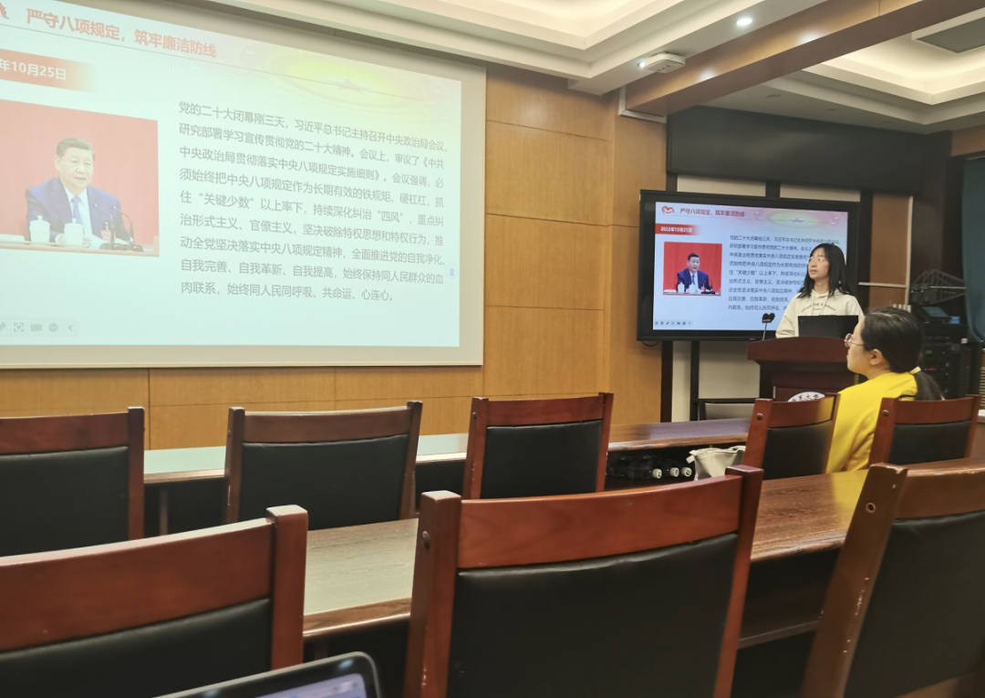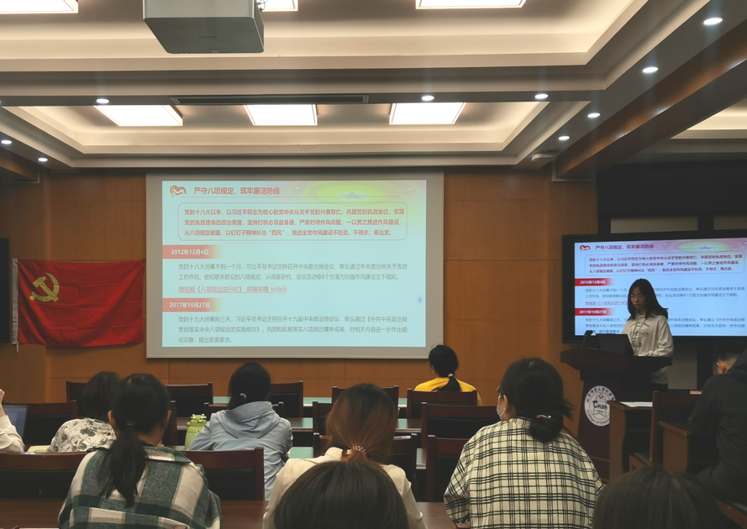 最后,陈昱臻同志说明了中央八项规定与中央八项规定精神的区别,强调全党同志都应该学习、遵守中央八项规定精神,力行勤俭节约、廉洁务实的工作作风,并附上学校根据中央八项规定提出的学习教育查摆内容帮助各位同志学习警示。