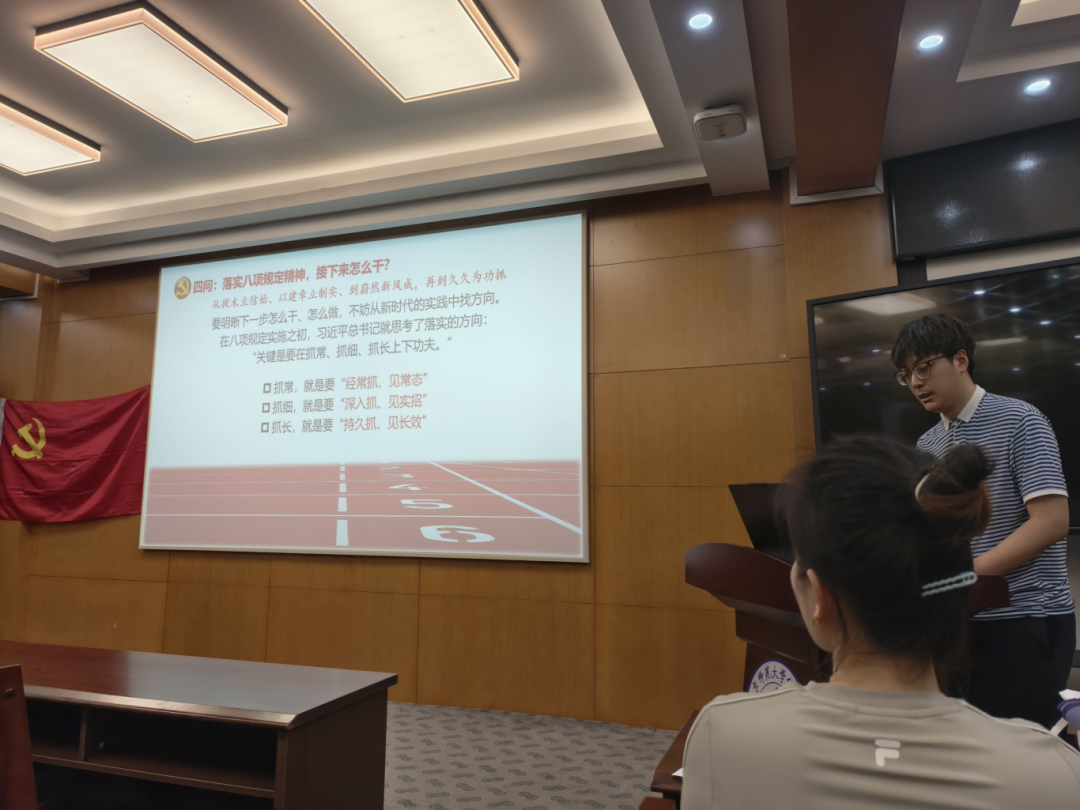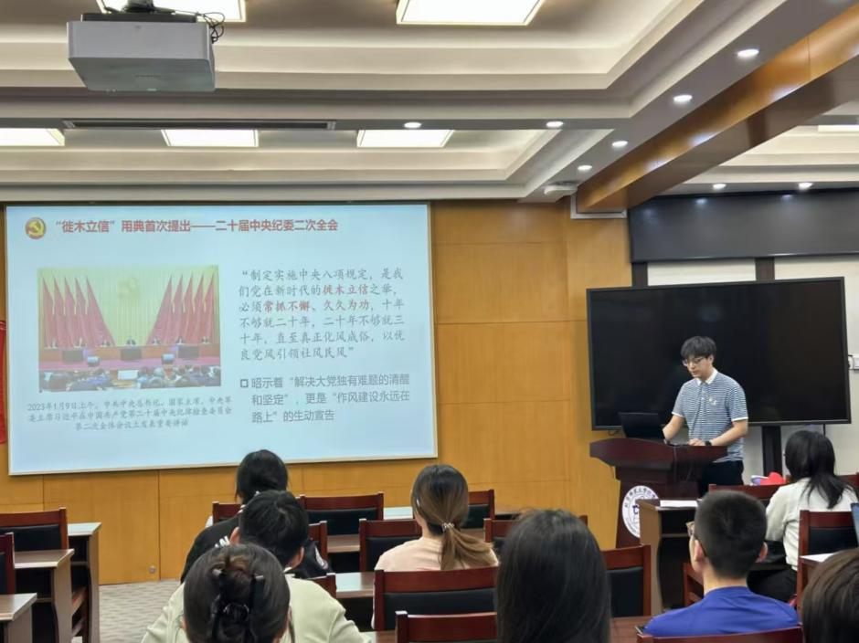 然后,刘淏晟同志解读了2025年3月24日人民日报第一版发表的“党在新时代的徙木立信之举”文章。2013年1月9日,在中国共产党第20届中央纪律检查委员会第二次全体会议上,习近平总书记发表重要讲话,提出“制定实施中央八项规定,是我们党在新时代的徙木立信之举,必须常抓不懈、久久为功,十年不够就二十年,二十年不够就三十年,直至真正化风成俗,以优良党风引领社风民风。”总书记将中央八项规定视作党对人民的重要承诺,用徙木立信强调其政治地位和历史定位,告诫党员干部要让规定落实不流于形式,取信于民。