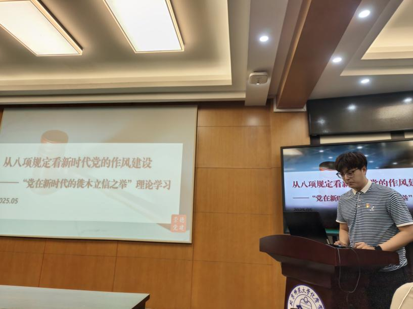 2025年5月8日19:00,bat365在线唯一官网登录官网崇德党支部活动组联合化学学院24级硕士生一班党支部在化学楼二楼学术报告厅开展理论联学活动。本次活动由崇德党支部活动组刘淏晟同志主持,活动主题为:从八项规定看新时代党的作风建设——“党在新时代的徙木立信之举”,旨在深化中央八项规定精神学习成效,通过影像教学与理论学习,深入理解新时代党的作风建设。