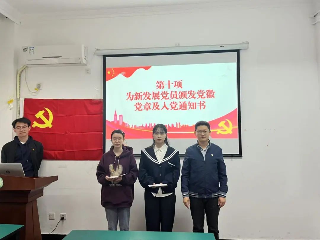 会议第十项,席超老师为两位新发展党员颁发党徽党章及入党通知书。