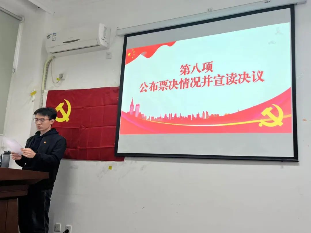 会议第八项,大会到会正式党员进行无记名投票。投票结束后由计票人计算选票并由主持人公布投票结果宣读决议。