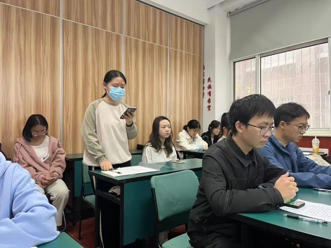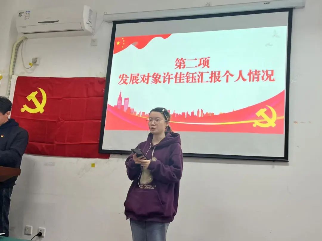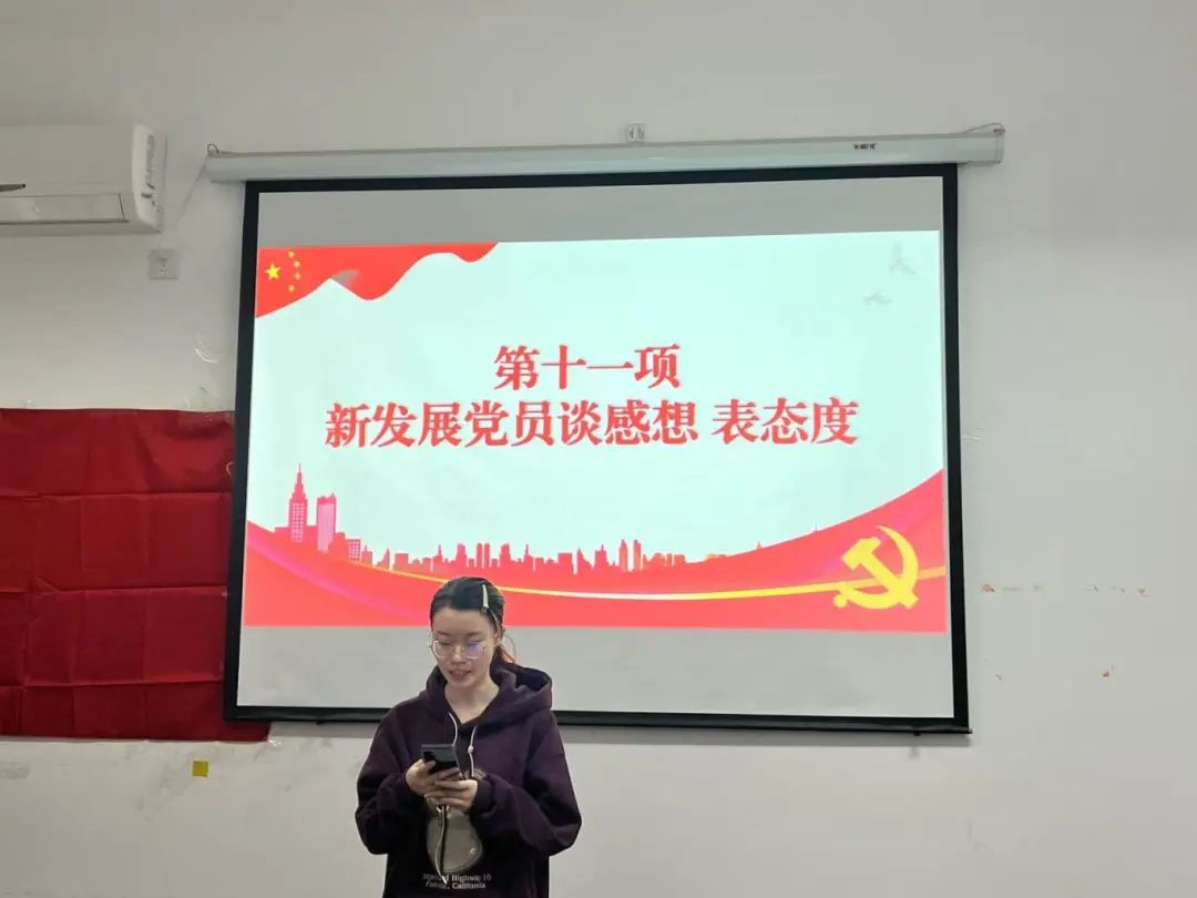 会议第十二项,学生组织员翟桉迪同志讲话,她认为本次发展流程符合规范,同时也对两位新发展党员表达了祝贺。