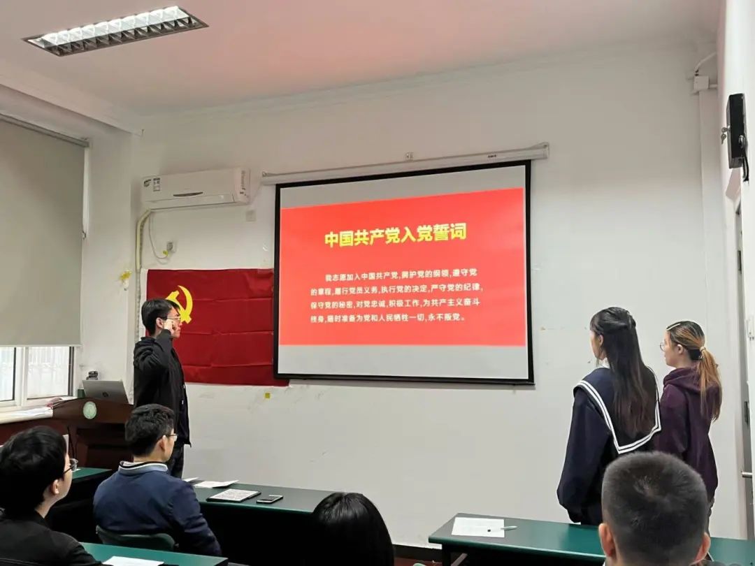 会议第九项,王奕雯与许佳钰两位同志在贾康宁同志的带领下进行入党宣誓。
