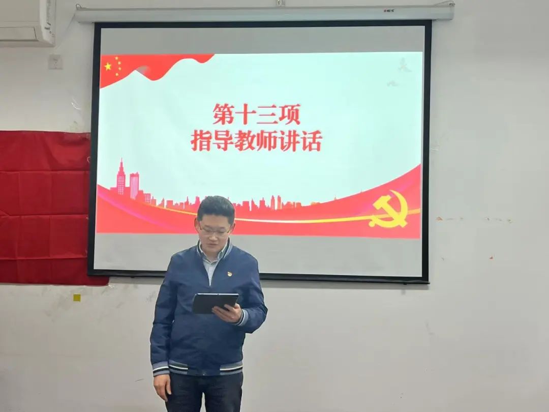 会议第十三项,笃行党支部指导老师席超老师讲话,他对新发展党员表达了祝贺以及深切期望之情,强调了党员的自我教育与约束的重要性,希望大家能够严格要求自己,积极发挥党员的先锋模范作用。