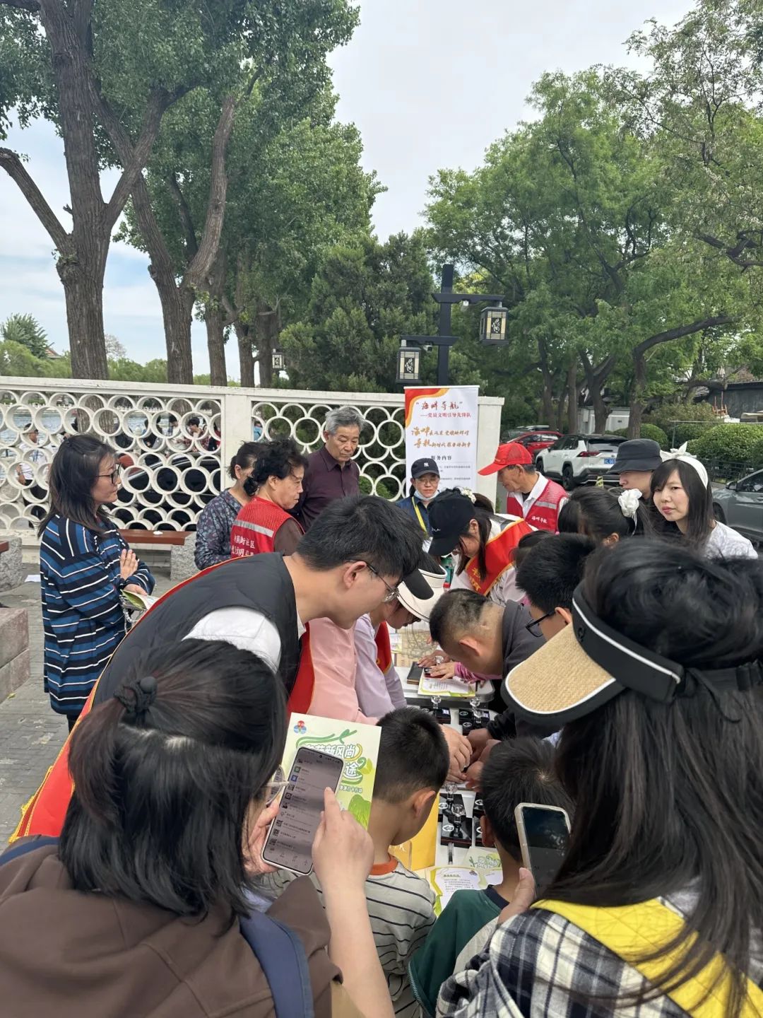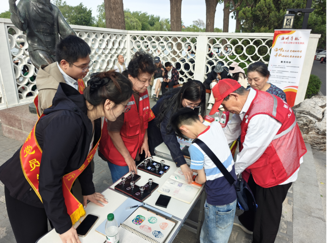 两支部的党员同志们以饱满的热情投入到什刹海景区的志愿服务活动中,他们分工协作,向游客介绍什刹海的历史文化、特色景点及游玩路线等实用信息,同时耐心讲解打卡集章活动的规则与特色;协助每一位集章爱好者完成套章收集,并为其定格纪念瞬间。