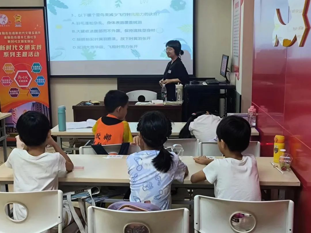8月1日,高俪纯同学为金融街丰汇园社区的孩子们带来了一堂题为《飞翔的秘密——鸟类的独门秘籍》的科普课程。课堂上,高俪纯同学通过思想实验、趣味问答以及视频演示的方式,深入浅出地向孩子们讲解了鸟类飞翔的原理和独特技巧。为了让孩子们更直观地了解鸟类的飞行结构,她还特意带来了鸟类的飞羽,让大家亲手感受飞羽的构造和功能。整堂课充满互动与乐趣,孩子们在愉快的氛围中不仅掌握了丰富的鸟类知识,还激发了对自然科学的浓厚兴趣。