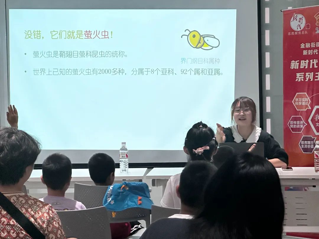 7月13日,马甫贺和魏莘烁同学一起为金融街丰盛社区的小朋友们带来了一堂科普课——《萤火虫为什么会发光》,为小朋友们介绍了萤火虫的身体结构、发光原理、生命周期、生存环境、捕食方式和面临的威胁等方面的知识。在讲解过程中,小朋友们都积极地回答问题和参与讨论,展现出对科学知识的浓厚兴趣。课程结束后,家长和小朋友们都表示这是一次生动、有趣、富有启发性的科普课堂。