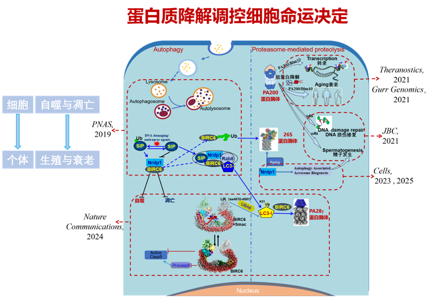 蛋白酶体及自噬介导的蛋白质降解参与蛋白稳态调控,其紊乱导致发育异常及疾病发生。前期主要发现蛋白质降解在凋亡、衰老及精子发生中的作用机制,揭示巨型泛素化酶BIRC6/BRUCE促进自噬标签蛋白LC3-II的前体LC3-I通过PA28r蛋白酶体降解(PNAS, 2019),并阐释BIRC6调控自噬及凋亡间转换的分子机理(Nat Commun., 2024);阐明PA200蛋白酶体维持转录及衰老过程中组蛋白修饰稳定性的表观遗传调控机制(Theranostics,封面文章, 2021;Curr Genomics, 2021;Biological Reviews, 2018;Int. J. Mol. Sci., 2024);发现泛素连接酶Nrdp1、泛素受体亚基Rpn13及Rpn10、睾丸特异性蛋白酶体亚基a4s等调控配子发生的分子机制(Cells, 2025& 2023; JBC, 2021)。获授权中国发明专利1项(2025)。以上成果为治疗癌症、不孕不育及衰老相关疾病提供依据。