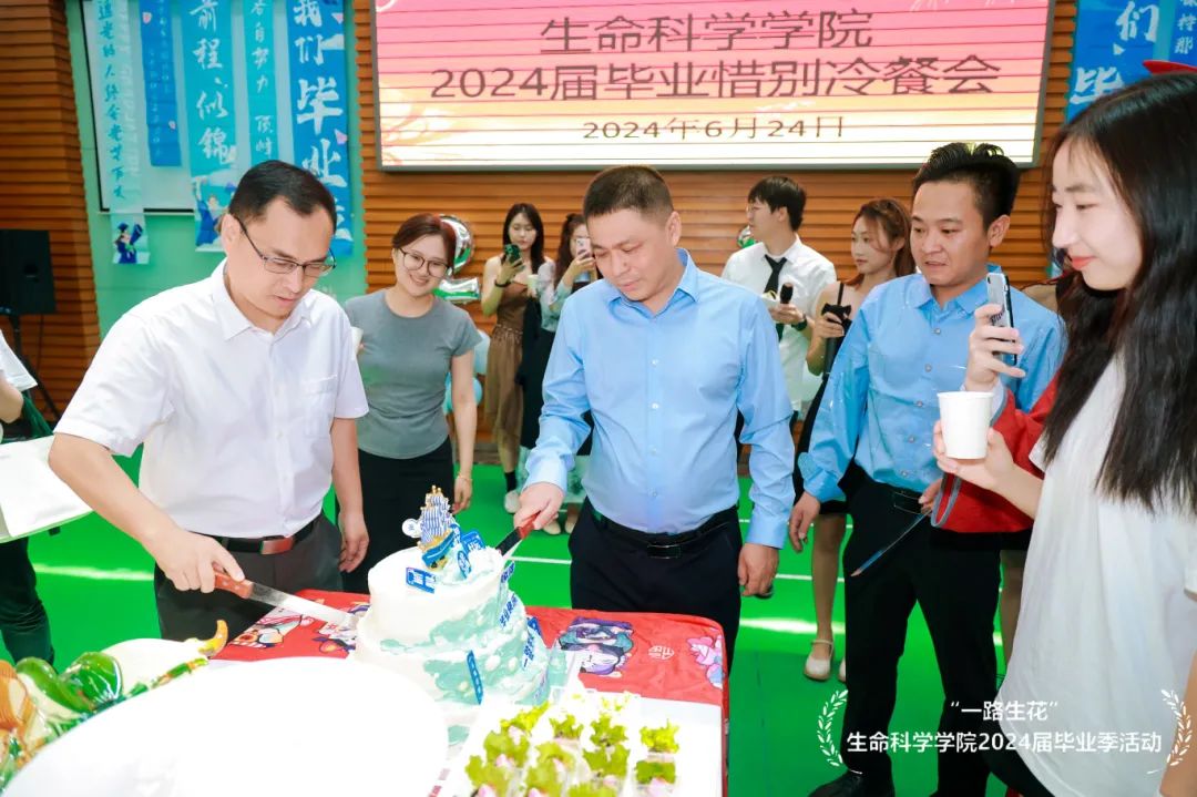开场歌曲结束后,学院党委书记王天明教授和院长窦非教授分别致辞,为毕业生们送上临别的祝福,随后两位老师向为毕业生们精心准备的“香槟塔”中倒满饮料,并一齐切下第一块毕业蛋糕。同学们纷纷走向会场中间,举起自己手中的高脚杯,庆祝在师大生科院的求学生涯顺利结束。