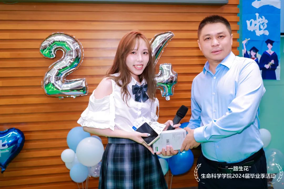 此次冷餐会上,各毕业班级一齐筹划了5个游戏摊位,包括“见字如面,尺素传情”明信片设计、创意插枪头竞赛、校园拼图、红外探秘、扇子DIY等。现场活动氛围热烈,充满了同学们的欢声笑语。此外,每个游戏摊位都设有专属印章,收集印章即可抽取生科院文创周边纪念品。在游戏环节的间隙,毕业生朱原辛走向场地中央献上祝福的歌曲,优美的歌喉赢得了在场同学的阵阵掌声。