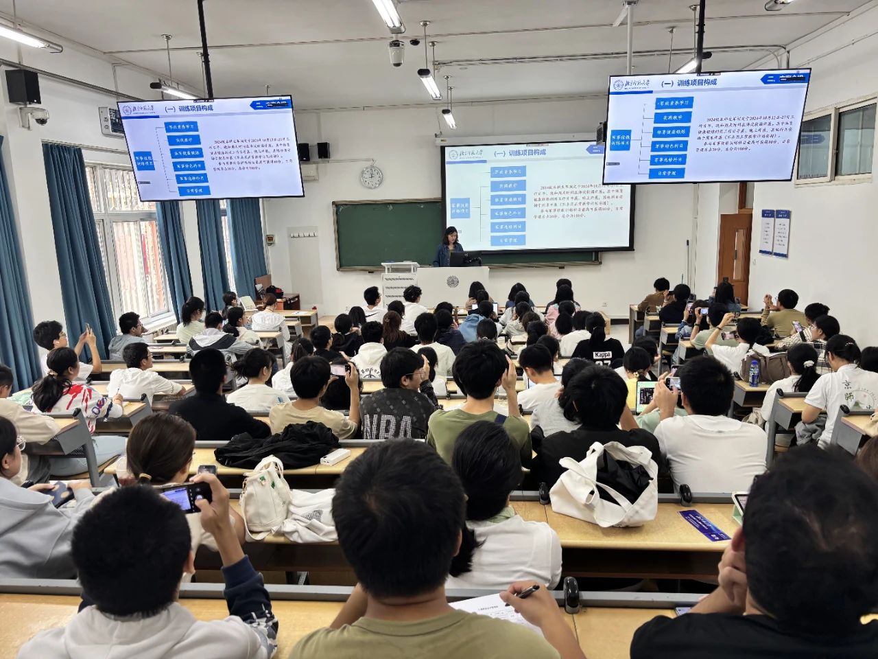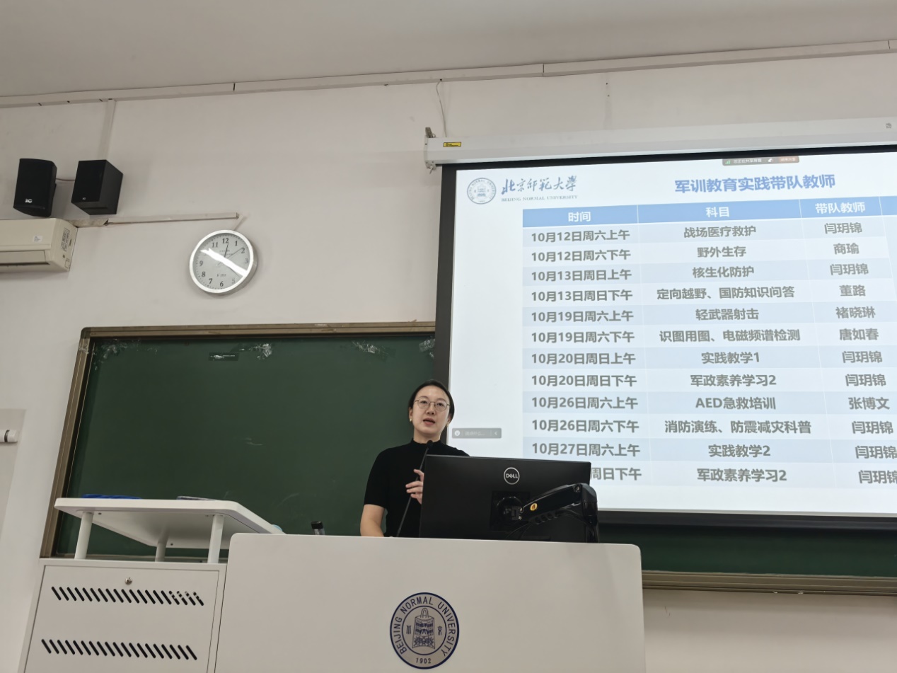 闫玥锦老师向2024级的同学们阐述了今年军事技能训练方案的主要内容、组织方式、考核标准、纪律要求以及行为规范,为同学们的军训之路指明方向。同学们认真聆听,对军训的部署和规则有了总体的认知与规划,也明确了自己的任务安排,为接下来的10月军训打下良好基础。