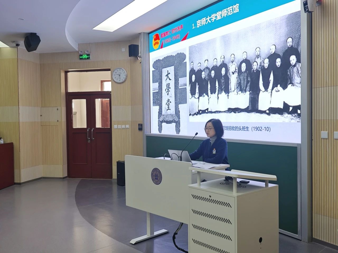 学员团委书记唐如春老师带来了一场精彩的团课,主题为“高举团旗跟党走,青春铸就中国梦——bat365官网登录入口体育青年运动史”。她带领同学们穿越时空,一同见证北师大的青年们在不同历史时期的奋斗历程。1902-1949年期间,师大青年成立抗俄铁血会、北师大学生会、中华民族解放先锋队等爱国组织,英勇投身五四运动、三一八惨案、一二九运动,发出振聋发聩的爱国救亡时代先声。1929-1978年期间,师大青年胸怀祖国投身建设,支持抗美援朝与土地革命,到祖国最需要的地方去 。1978-2002年期间师大青年乘改革春风勇立潮头,加强新时期革命传统教育,倡导尊师重教的社会新风。时至今日,木铎金声跨越百年,师大学子在无数重大历史事件中展现青年担当,学习践行“四有”好老师讲话精神,形成积极向上、影响力强的校园文化格局,迈入砥砺奋进的崭新时代。最后,唐老师期待同学们能铭记历史,继承红色基因,不忘初心、砥砺前行,为中国梦和师大梦贡献青春力量。
