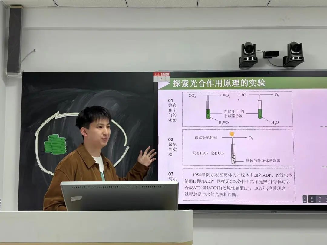 第二位选手张兴的试讲内容为《光合作用与能量转换》,将光反应与暗反应的物质与能量变化、叶绿体结构与功能的关系作为教学重点。从情景导入到知识回顾,再到科学史探究、模型建构、巩固提高,最后是课堂小结和课后任务,各个环节紧密相连,逻辑连贯,符合学生的认知规律。针对光反应与暗反应的动态平衡这一难点,通过模型建构、类比教学等方法,帮助学生理解光合作用中复杂的物质和能量转化过程。