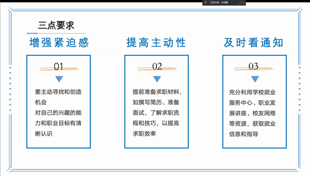 与此同时,谷老师针对同学们的需求讲解了求职过程中的一些重要时间节点及注意事项,并对学校、学院提供的就业指导和帮助政策进行介绍。
