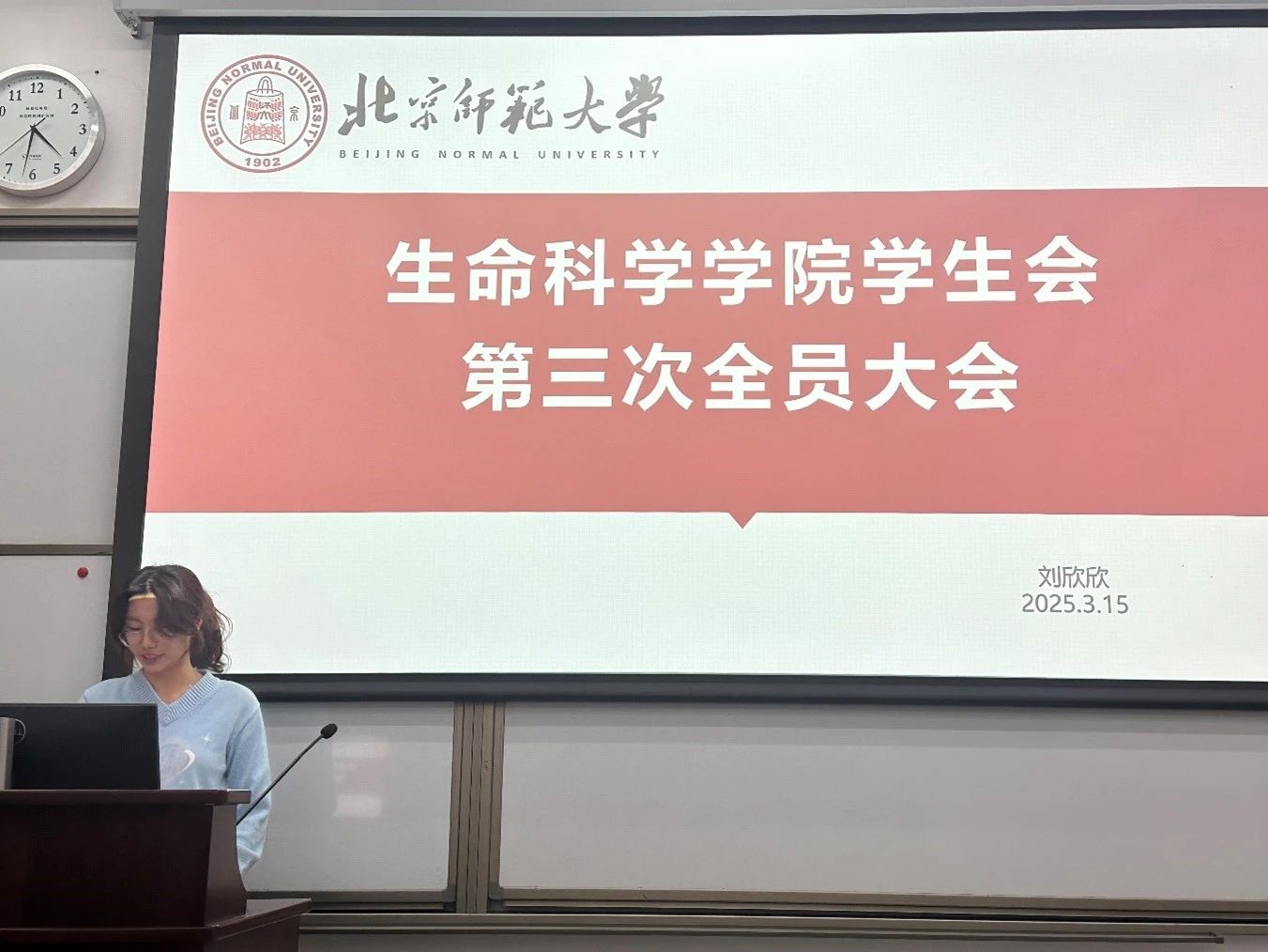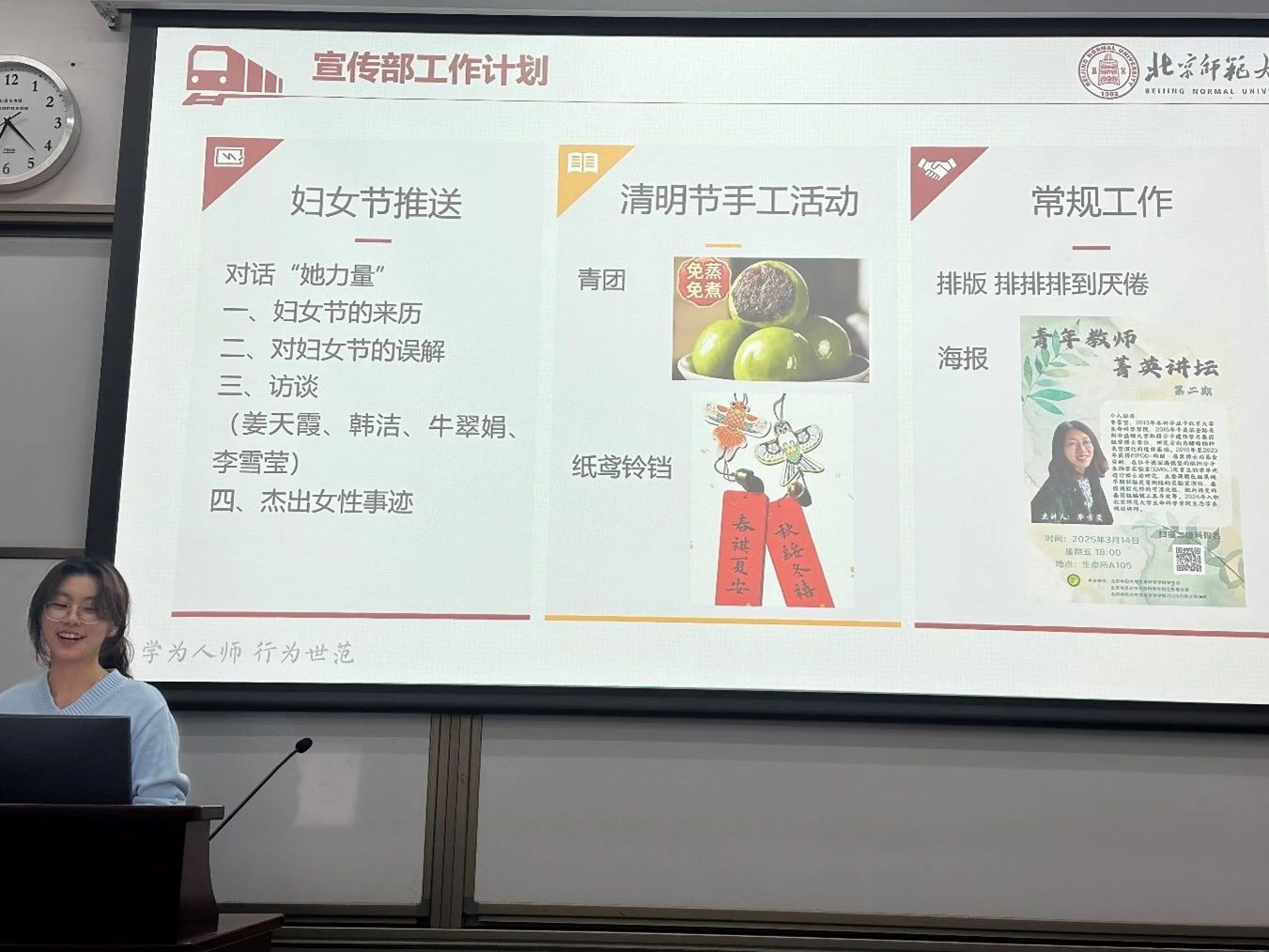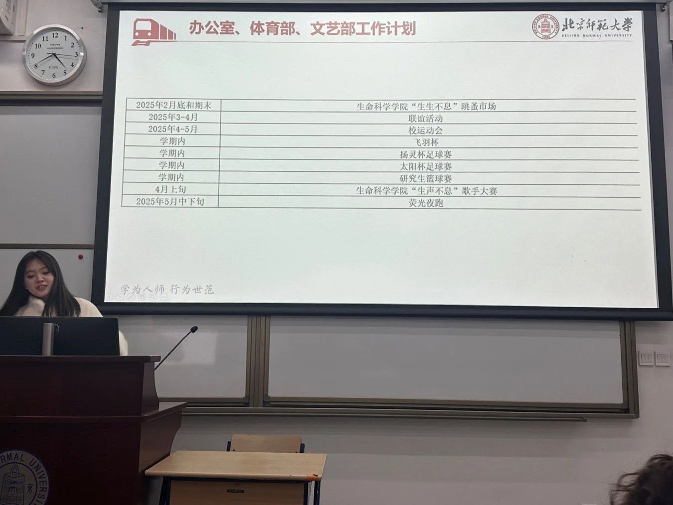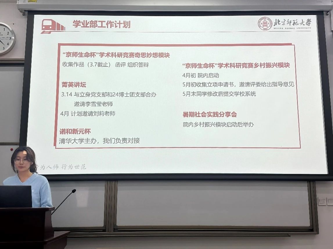 会议的第一部分是部门工作计划介绍。刘欣欣主席首先详细介绍了学业部和宣传部在本学期的工作计划。本学期,学业部将开展多项学术活动,包括“京师生命杯”学术科研竞赛奇思妙想模块、“京师生命杯”学术科研竞赛乡村振兴模块、菁英讲坛、诺和新元杯、暑期社会实践分享会等等。而宣传部在日常的排版工作和海报、喷绘制作工作以外,还有两项大型活动:一是为庆祝刚刚过去的“三八”妇女节而举办的“对话‘她力量’”主题访谈活动,二是即将于清明节举行的主题手工活动。