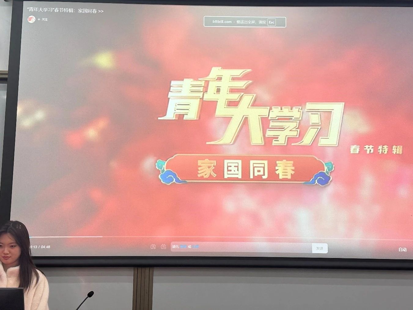 会议的第二部分是主题团课学习。韩子宜主席首先为学生会全体成员们播放了“青年大学习“春节特辑视频——”家国同春“。同学们一起回顾了我们刚刚度过的首个”非遗“年,又一次体会到了春节传统文化与现代科技的融合,如在春晚上爆火的”跳舞机器人“、线上拜年、数字红包等,感受了青年在传承与创新中的重要作用。青年在享受春节团圆的同时,不忘肩负的时代责任,鼓励青年将个人理想融入国家发展,为实现中华民族伟大复兴贡献力量。